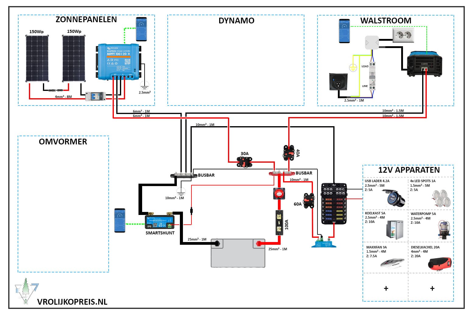 - 1 keer 150Wp zonnepaneel: Victron MPPT 75-15, zekering 20A
