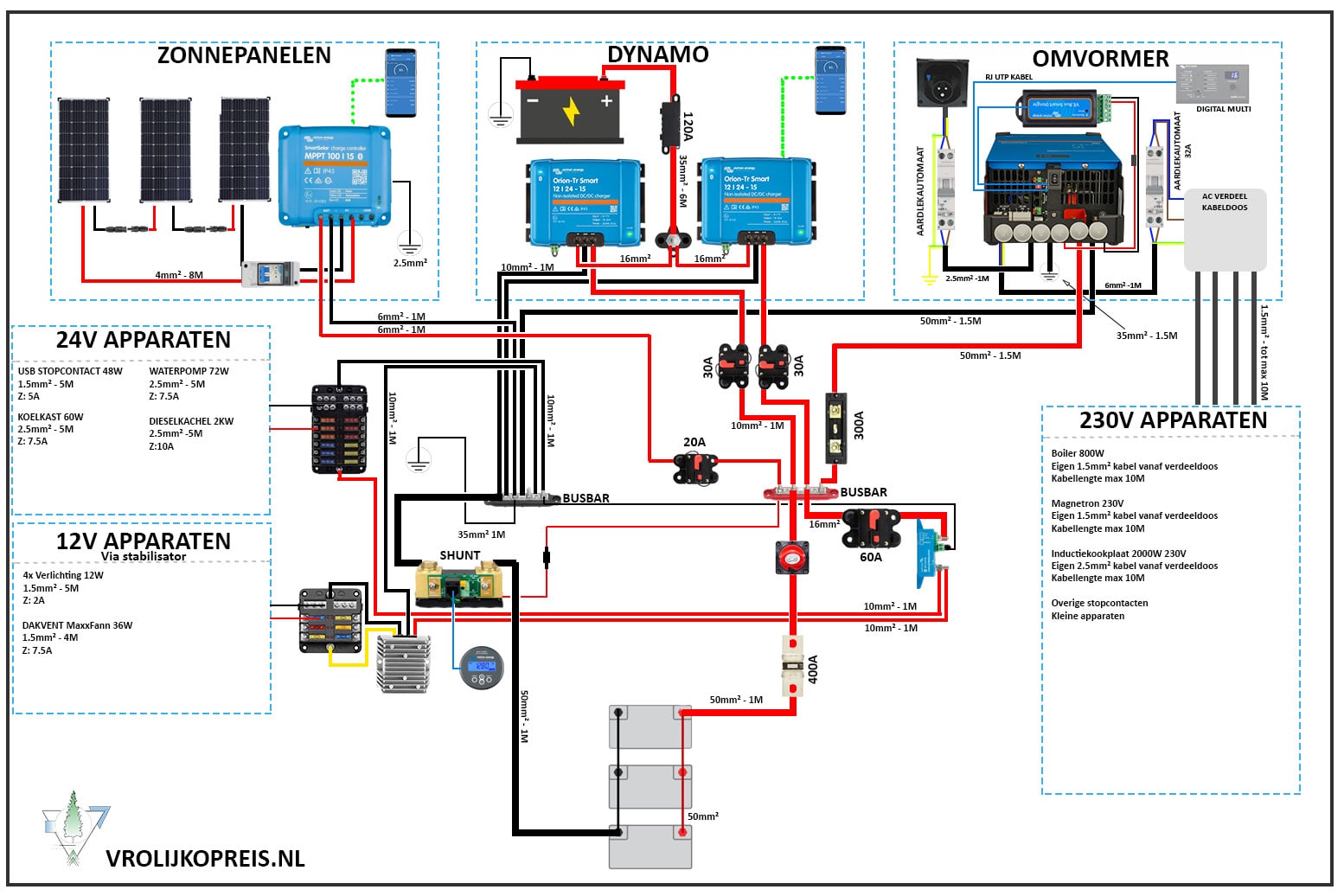 In het plus schema vind je drie lithiumaccu’s van 24V – 100Ah, deze zijn samen goed 7200Wh. Hiermee is koken op inductie mogelijk en eventueel ook een airco off grid te laten draaien.